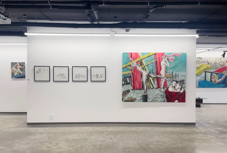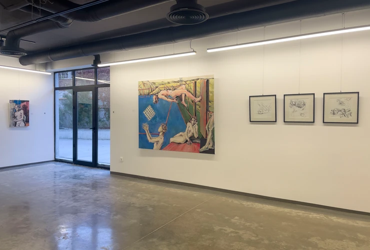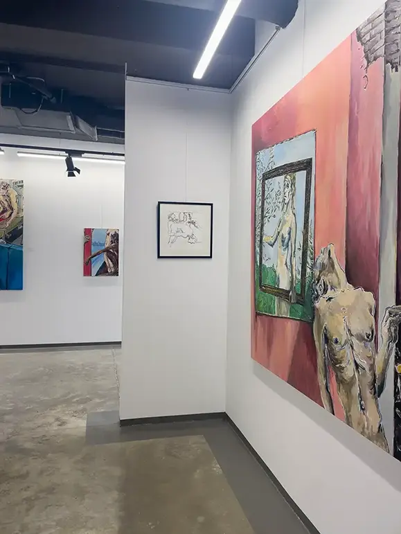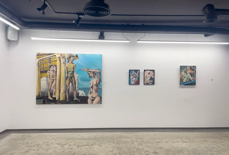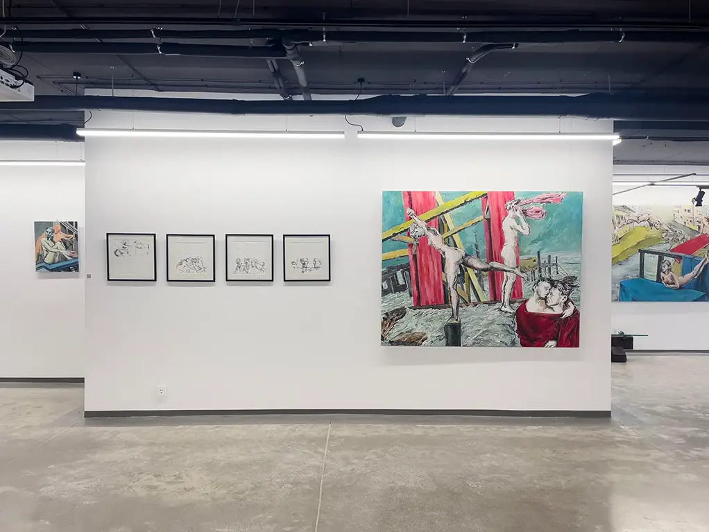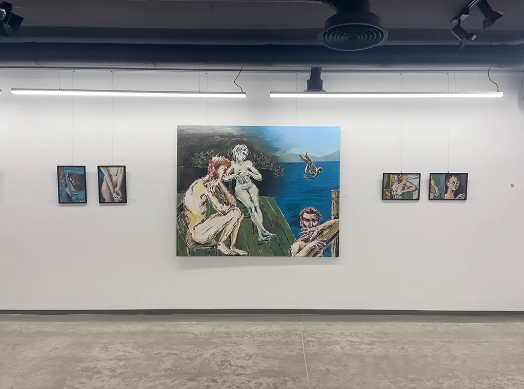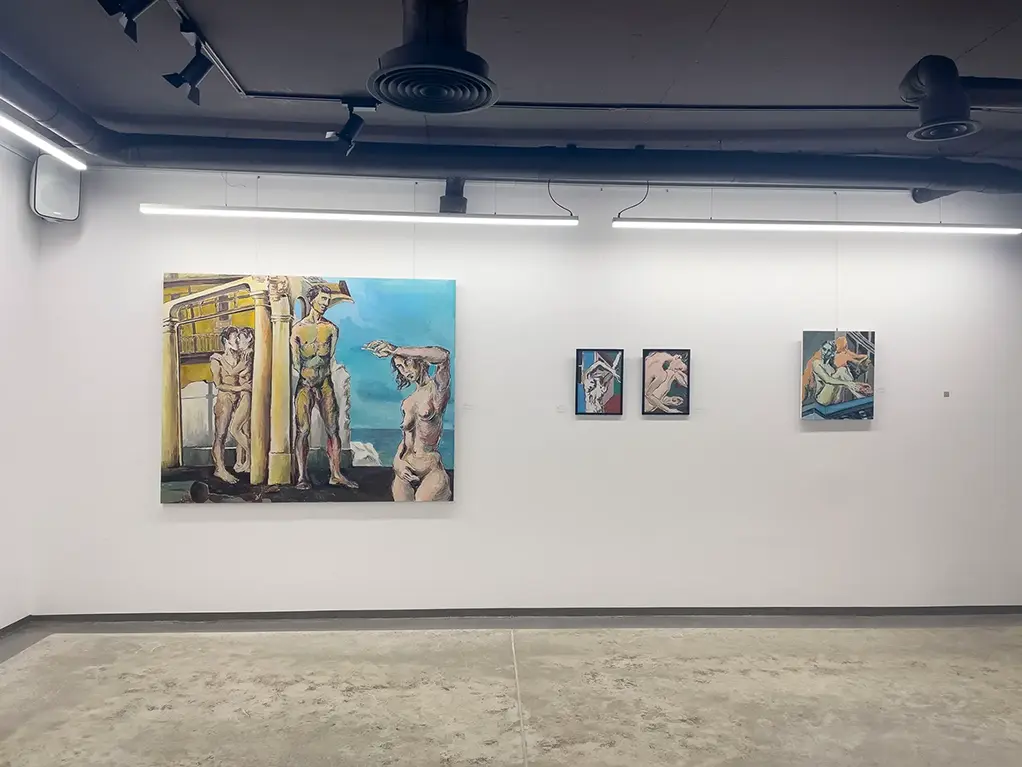 The paintings speak in the language of thresholds. A wave rises but never quite breaks; a figure falls but remains suspended in the painted field; a shelter is sought but not fully found. Tamar renders these states of in-between with a raw directness, pushing the canvas to hold what reality itself often cannot: a moment before its own collapse or completion. In this way, her large-scale works extend the exhibition's central proposition, that time may be less a linear path and more a conducting medium through which we drift, collide, and transform.